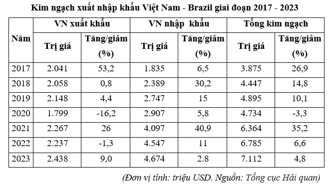 07 tháng đầu năm 2025, trao đổi kim ngạch hai chiều đạt 4,45 tỷ USD, giảm 3% so với cùng kỳ năm 2024. Trong đó, Việt Nam xuất khẩu sang Brazil 1,53 tỷ USD, %, Việt Nam nhập khẩu từ Brazil 2,92 tỷ USD, giảm 4,7%.