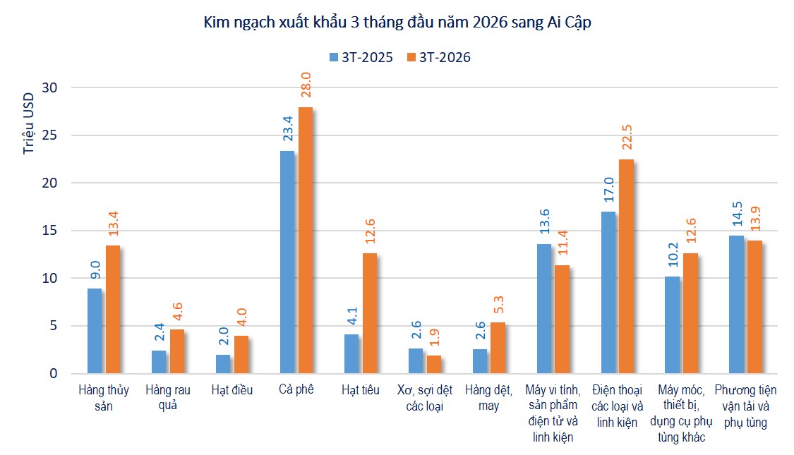 Theo số liệu sơ bộ của Cục Hải quan Việt Nam, kim ngạch xuất khẩu 3 tháng đầu năm 2026 của Việt Nam sang thị trường Ai Cập đạt 149,6 triệu USD, tăng 21,8% so với kim ngạch xuất khẩu cùng kỳ năm 2025.