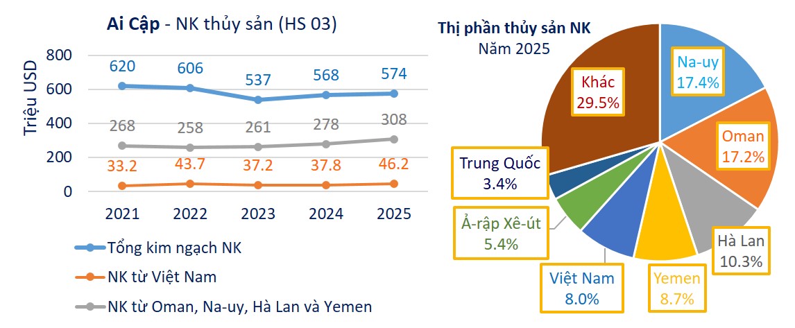 Thủy sản Việt Nam chiếm 8% thị phần thủy sản nhập khẩu của Ai Cập trong năm 2025, sau Na Uy, Oman, Hà Lan và Yemen. Tuy nhiên, Ai Cập chủ yếu chỉ nhập khẩu phi lê cá basa đông lạnh (HS 0304.62) của Việt Nam, trong khi tôm đông lạnh chủ yếu được nhập khẩu vào Ai Cập qua các nước Ả Rập để được hưởng lợi từ mức thuế nhập khẩu cao.