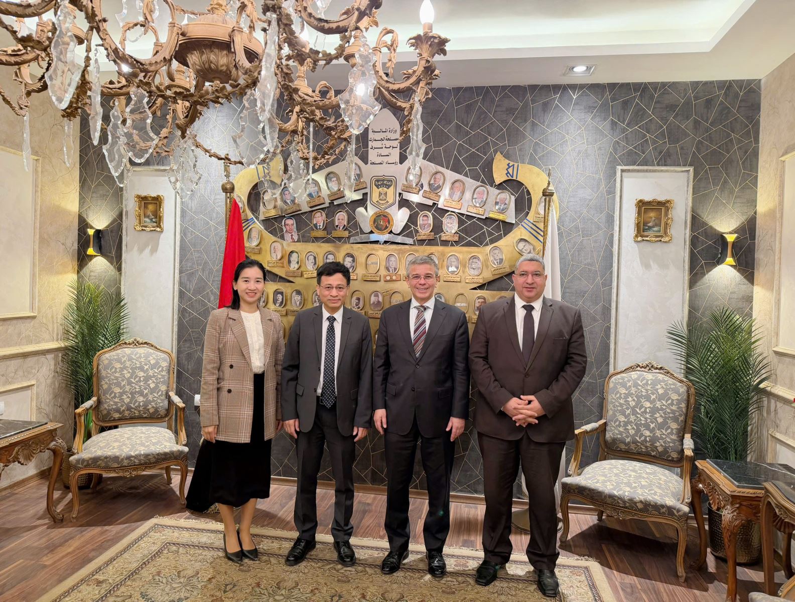 Ông Ahmed Amawi, Cục trưởng Hải quan Ai Cập (thứ hai từ phải sang) chụp ảnh lưu niệm với các cán bộ Thương vụ sau buổi làm việc.