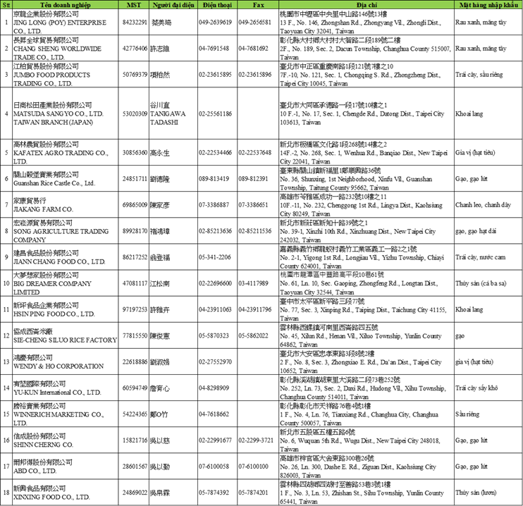 Danh sách doanh nghiệp do Thương vụ tổng hợp lần này được tổng hợp từ nguồn thông tin của Cơ quan quản lý Thực phẩm và Dược phẩm Đài Loan (FDA), kết hợp với khảo sát thực tế của Thương vụ Việt Nam tại Đài Bắc. Các doanh nghiệp trong Danh sách phân bố tại nhiều địa phương như Đài Bắc, Tân Bắc, Đào Viên, Cao Hùng, Đài Trung, Vân Lâm…, đóng vai trò quan trọng trong việc kết nối, phân phối và đưa hàng nông sản Việt Nam tiếp cận sâu hơn vào thị trường bản địa.