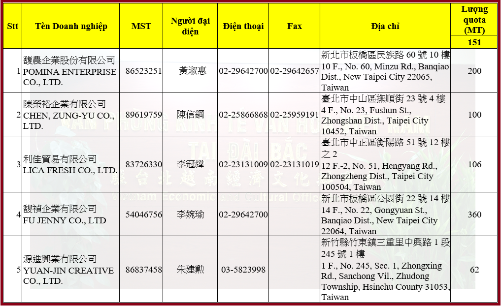 Danh sách các doanh nghiệp được phân bổ hạn ngạch nhập khẩu dừa năm 2026 (đợt 1) dựa trên kết quả lượt đấu thầu 151 (Summary List of Bid - Opening Result for the WTO Tariff Rate Quotas of year 2026 allocated through a competitive process) được Thương vụ Văn phòng Kinh tế Văn hóa Việt Nam tại Đài Bắc tổng hợp trên cơ sở công bố cấp chứng nhận của Ngân hàng Đài Loan (BOT).