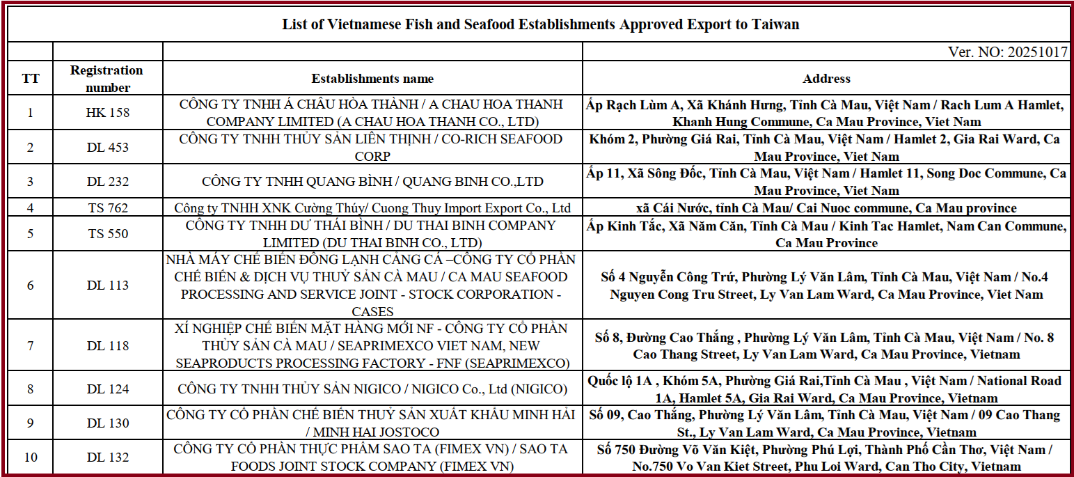 Với việc phê chuẩn và cập nhật lần này, hiện có 772 doanh nghiệp thủy sản Việt Nam được phép xuất khẩu vào Đài Loan (Thông tin chi tiết như phụ lục kèm theo).