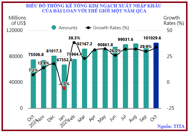 Dữ liệu do Cơ quan quản lý Ngoại thương Đài Loan (TITA) tổng hợp dựa trên công bố của Cơ quan quản lý Tài chính Đài Loan (MOF) cho thấy, kim ngạch xuất nhập khẩu của Đài Loan trong tháng 10⁄2025 đạt 101,029 tỷ USD tăng 33,8% so với cùng kỳ năm trước.