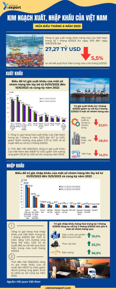 Theo số liệu của Tổng cục Hải quan Việt Nam, trong kỳ 1 tháng 6/2023, kim ngạch xuất nhập khẩu hàng hoá đạt 27,3 tỷ USD; trong đó xuất khẩu đạt 13,70 tỷ USD và nhập khẩu đạt 13,57 tỷ USD.